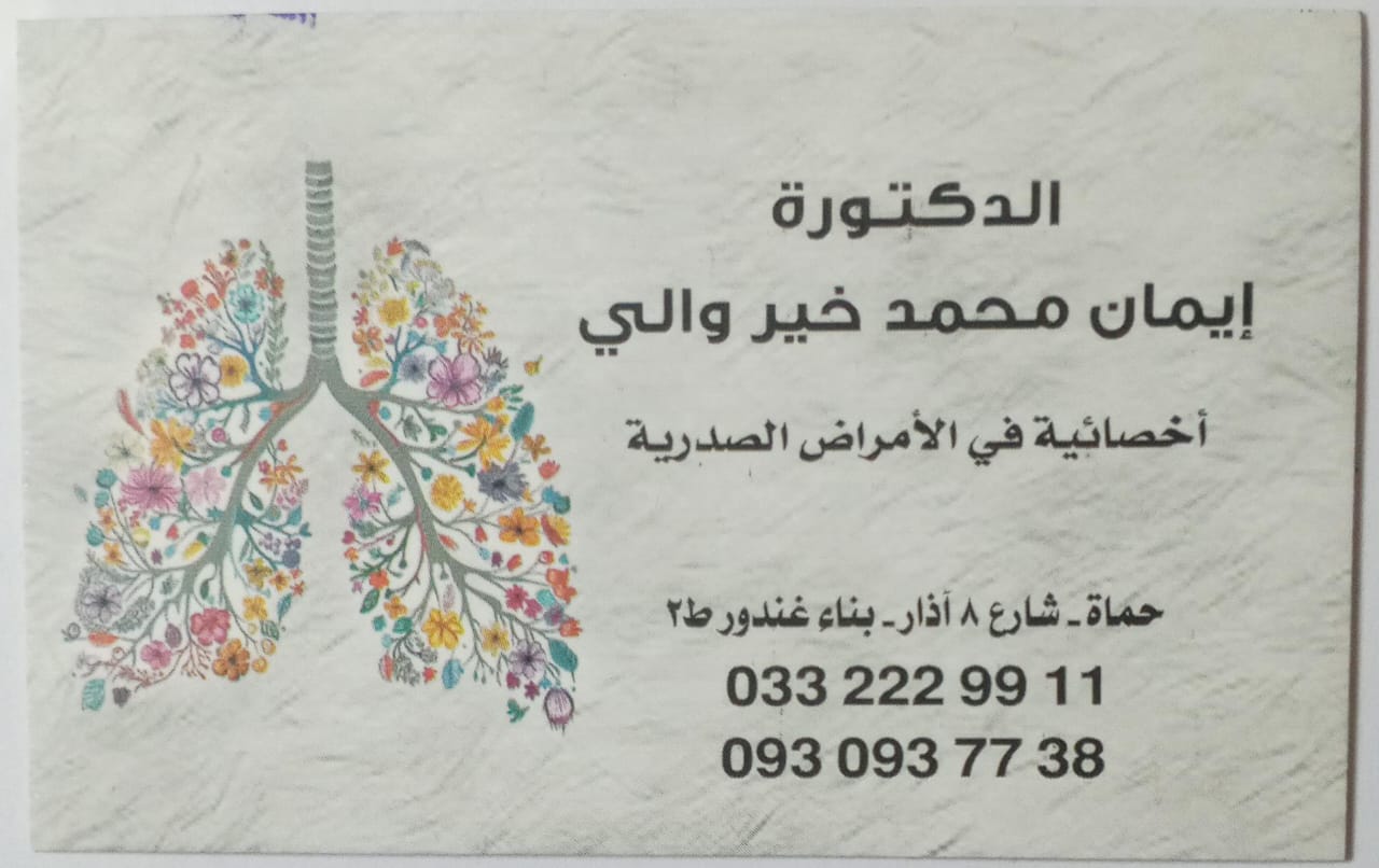 الدكتورة إيمان والي أخصائية في أمراض الجهاز التنفسي حائزة على شهادة البورد السوري
